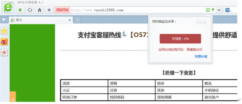 图:360安全浏览器“照妖镜”鉴定虚假的支付宝客服网站 据郑女士介绍,1月1日元旦,她在淘宝网上看中了一款皮衣,打折促销价格是688元,感觉价格相对比较实惠,她便付了款购。“我原来就是在网上给手机充充话费之类的,没有网购过衣服,所以我还特别留了个心眼,把付款成功的网页截了图,上面写着我可以通过淘宝客服与卖家商量发货时间”,郑女士说道。 可过去了5天,郑女士还是没有收到皮衣,心理有些着急的她通过百度搜索了客服电话,点击进入了一个专门的支付宝客服网站。“我看那个网站挺专业的,有客服人员主动和你网上沟通,还有0571开头的客服电话”,郑女士按照号码拨了过去,接电话的是一个南方口音的男子,该男子询问了郑女士的淘宝单号和商品名称后很快告诉她皮衣没有合适的尺码了,但可以帮助郑女士退款。 郑女士见对方十分热心,便答应了。“你需要找个银行的自动取款机才能退款”,该男子告诉郑女士ATM退款比网上要更快速。郑女士也没多想就来到了家附近的一个ATM机,在该男子的指导下稀里糊涂到了转账界面。男子告诉郑女士现在输入自己的密码,按确定就可以收到退款了。郑女士以前从没有在ATM机上进行过转账,便输入了自己的密码,结果却转出了4000元。这时男子突然挂了电话,郑女士这才发现被骗。 记者了解到,误信钓鱼网站被骗钱财的案件时有发生。此次郑女士碰上的是虚假淘宝客服钓鱼网站,不法分子利用淘宝网购市场的火爆,制造了看似正规的虚假客服网站及热线,专门对淘宝购物不了解或者中老年网购群体进行诈骗。因涉及银行转账交易,危害十分巨大。 那么如何才能防范虚假钓鱼网站呢?记者从360安全专家处获得建议,用户在上网时可选择使用360安全浏览器,其内置了“照妖镜”等钓鱼网站防御功能,消费者在网购前可先用“照妖镜”鉴定网站可信度,如果结果显示为黄色或红色,就证明网站存在安全风险,用户应立刻关闭网页,以防被骗。