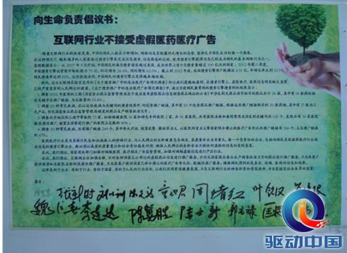 在此,我们倡议,互联网企业加强自律,不对各种国家已公布过的虚假药品信息进行推广服务,不对无国家药品食品生产销售批准文号的药品进行推广服务,不为其客户提供假冒知名医院名称的混淆性推广服务,不为其客户提供国家已明令禁止的医疗广告夸大性、欺骗性推广服务,确保网民得到的是真实、准确、客观的信息和结果。