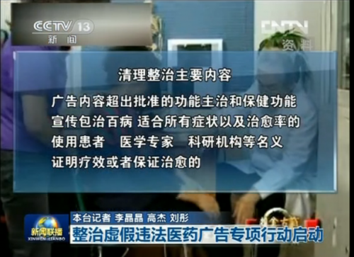 4月22日《新闻联播》报道,国家工商总局等八部门当天起将联合开展为期三个月的整治虚假违法医药广告专项行动。整治范围包括各类报纸期刊、广播电台、电视台以及大型门户类网站、搜索引擎类网站、医疗药品信息服务类网站。据了解,随着我国互联网的快速发展,虚假医药广告已经开始借助互联网、特别是搜索引擎等渠道进行传播,对网民以及患者的身体健康造成极大威胁。