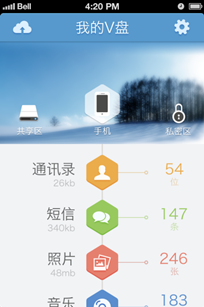 VPAN(V盘)备份空间分为私有盘、公共盘两部分。私有盘需要用户密码才能登陆访问,重要短信、联系人、照片、视频等可以存放在此,安全可靠。公共盘和私有盘分类清晰,能更加合理保护个人隐私。