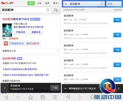 当书虫搜索网络读物时,搜狗浏览器可以在屏幕下方直接给出小说的下载地址,点击并可进行下载。让用户省去了找书、载书困难的烦恼,也避免用户用手机在线阅读所造成的流量损失以及许多小说网站频繁弹出的广告。