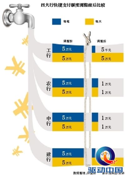 此前,工行、农行、中行已经下调了用户使用支付宝快捷支付的额度。其中,工行的额度由原先的单笔5万元下调为5千元,每月限额则从20万元降为5万元。中行、农行则将额度从原先的单笔5万元降为单笔1万元。