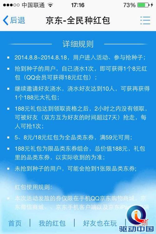 但对于京东在手机QQ上嫁接出购物入口的重要信息,手机QQ一到六线乡村拥有广泛的用户基础。传送起来需要符合这一受众的特征。京东围绕着这一入口,手机QQ购物入口上线的8月8日,发起了全民种红包”趣味游戏,抢种子并浇水就能拿到8元-18元红包奖励,可作为东券使用。这类之所以经典,因为抓住的恰恰是低线乡村人群对“廉价、优惠”诉求以及价格敏感的特点。同时,这一人群曾热衷于偷菜游戏,种红包”很好地利用了这种惯性,并产生了认知和共鸣。