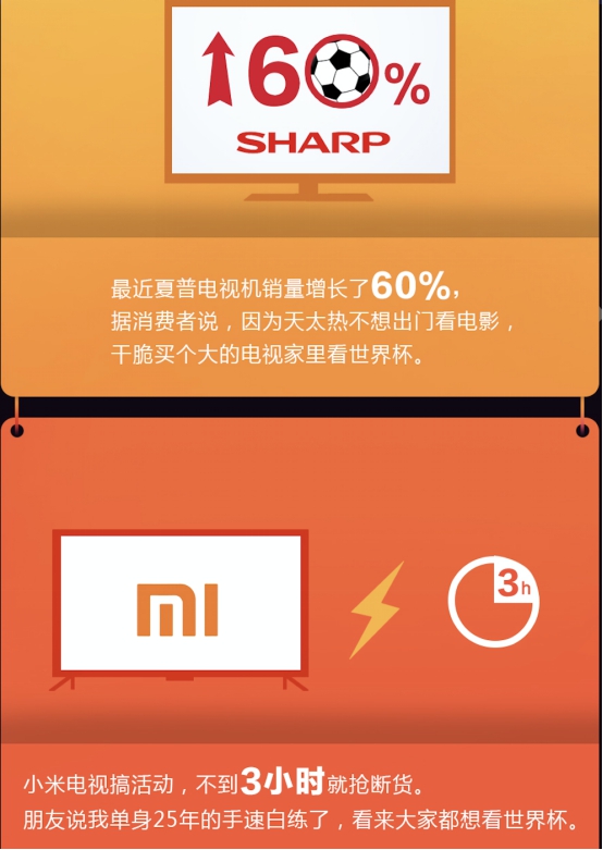 除了抵抗酷暑激发空调市场需求之外,世界杯的临近也为电商行业迎来一轮销售高峰,据苏宁608家电盛典战报数据,6月8日当天,夏普电视销量增长超过60%,小米电视相关活动更是创造了三小时卖断货的记录。球迷们的消费能力不可小觑。