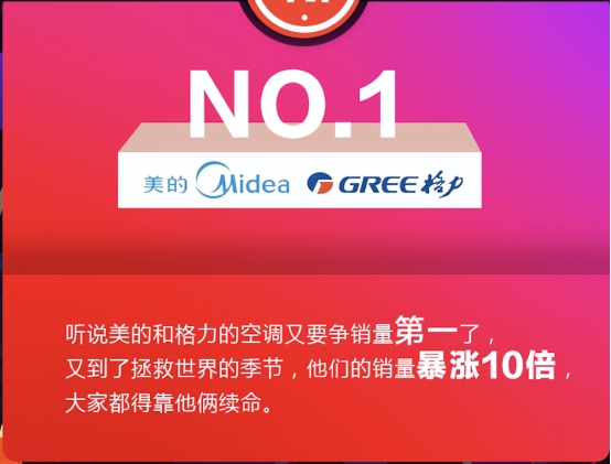 随着夏季的深入,漫长的酷暑天也将来临,空调迎来销售旺季,作为拥有线上线下双线优势的苏宁来说,各大空调品牌也将苏宁作为第一主场,在618这样的重要节点,包括美的、格力等大牌卯足劲发力,其中,在608家电盛典,苏宁空调专场搭起擂台,美的格力、奥克斯三大品牌同台PK,通过产品、价格及服务多维度直观对比的方式,满足消费者各类需求。根据战报,在6月8日当天,格力、美的空调销量各自暴增十倍,争抢第一宝座。