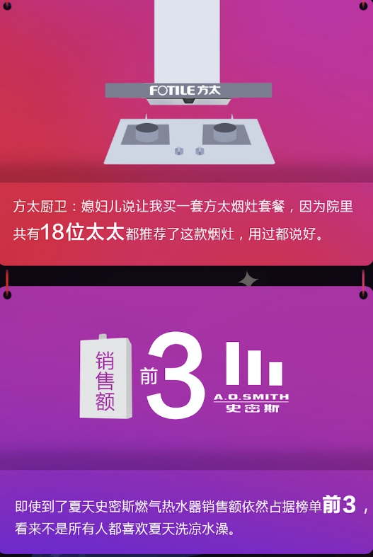 与此同时,在苏宁608家电盛典,厨电领域增势也非常抢眼,其中方太烟灶套餐成为年轻一代的热衷产品,凭借口碑在608家电盛典脱颖而出,另外,史密斯燃气热水器销售额占据榜单前三。