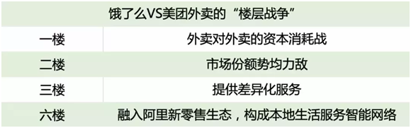 2018年,饿了么CEO王磊曾经对美团和饿了么之间的竞争阐述为“楼层之争”。王磊说,以前(饿了么未加入阿里之前)的竞争是美团站在二楼打一楼,饿了么融入阿里后,就要从六楼打二楼。2019年4月,王磊再次接受采访时表示,饿了么已经上到三楼了。