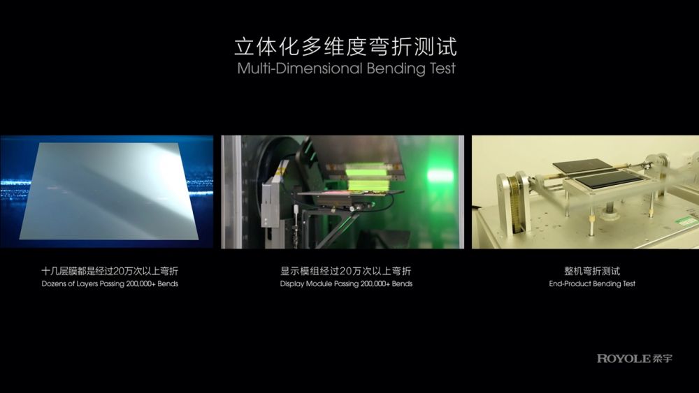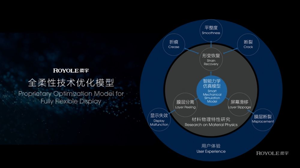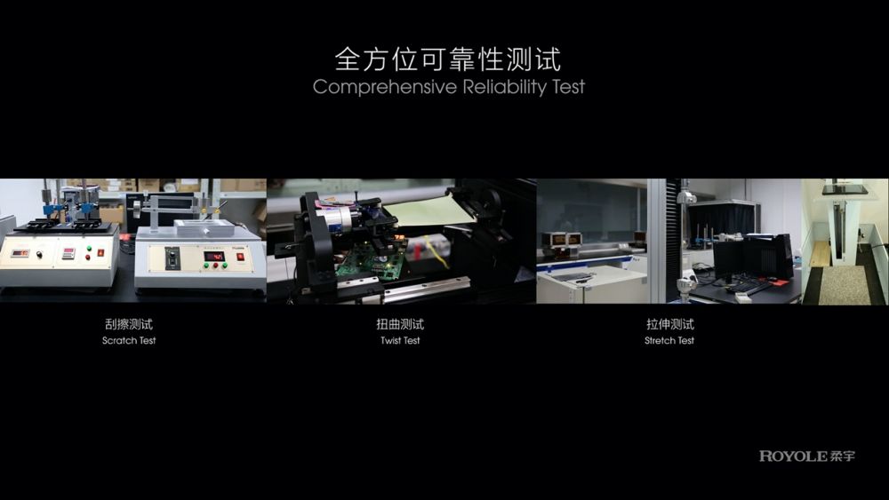在可靠性方面,凭借自主研发的柔宇智能力学仿真模型,可以快速计算测定不同柔性材料、堆叠结构、贴合工艺对全柔性屏性能的影响,还可根据客户需求反向测定符合要求的柔性材料和堆叠结构组合,实现高度定制化生产。在此基础上,柔宇从器件材料、柔性面板和终端整机三个维度,对第三代蝉翼全柔性屏进行海量立体多维测试,不仅对近百种膜层材料和完整的显示模组独立进行20万次以上的弯折可靠性实验,还分别对铰链和折叠整机进行极其严苛的可靠性测试,寻找到了全面提升柔性屏可靠性的最佳解决方案,大大改善了折叠屏手机和其他全柔性屏产品的使用体验。