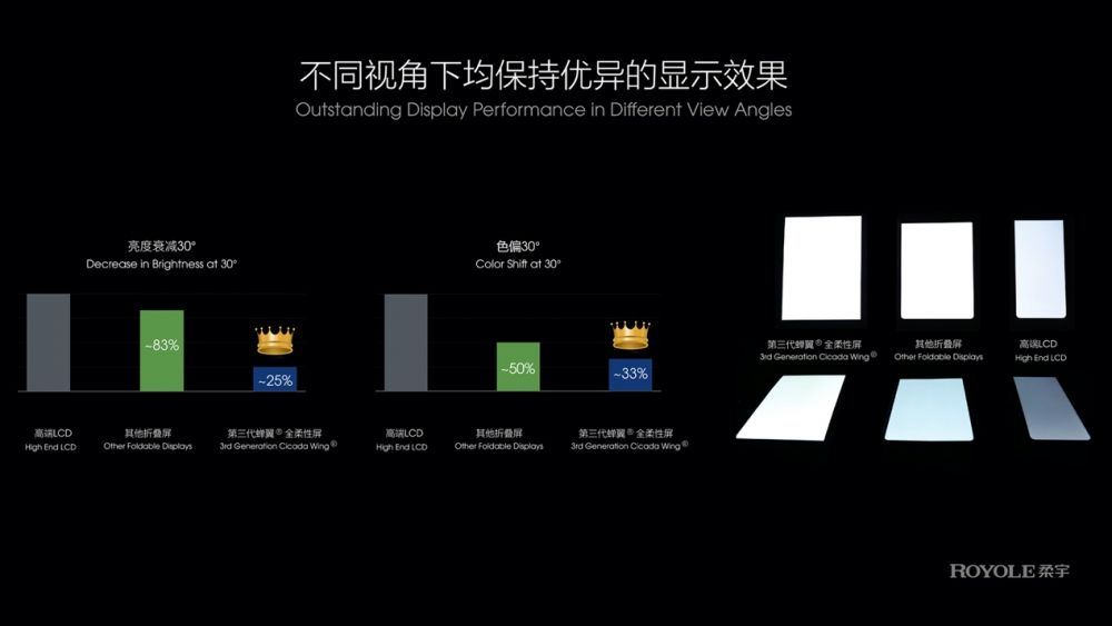 在显示性能方面,针对全柔性屏全新的显示形态,柔宇自主定义了新一代智能显示驱动芯片和电路设计,与第二代蝉翼全柔性屏相比较,第三代蝉翼全柔性屏的亮度提高50%,此外,在其他光学参数,包括对比度、色域、响应速度等,都达到了业内领先的色彩显示效果。对比市面上传统OLED屏,第三代蝉翼®全柔性屏在30°视角下色偏JNCD (Just Noticeable Color Difference)降低至0.6,亮度衰减优越1.5倍,均达到业内领先水平,无论在任何角度、形态下,都能拥有惊艳的画面表现。
