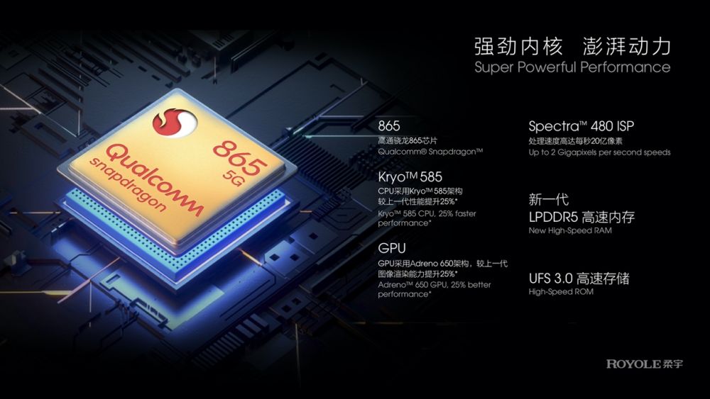 在性能方面, FlexPai 2也拥有旗舰配置,搭载高通骁龙865旗舰平台,支持5G双模和9个频段,实现全球多区域的覆盖包括中国、北美、欧洲、东南亚等,并配备最新一代LPDDR5低功耗内存和UFS 3.0高性能闪存。