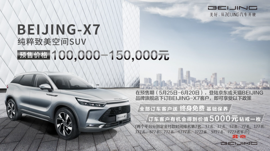 蓝鲸汽车5月25日讯 今日,在BEIJING-X7“纯粹致美探索日”探秘之旅上,北京汽车蓝谷营销服务有限公司总经理李一秀宣布BEIJING-X7全面开始接受预订,预售价格为10-15万元,预售政策包含终身免费保养和订车得钻戒等。