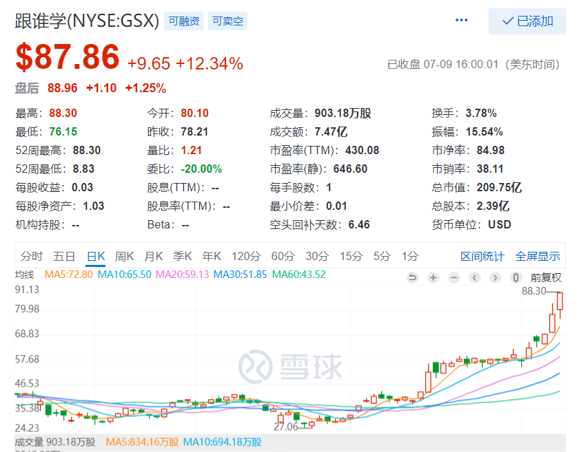 蓝鲸教育7月10日讯,北京时间昨日晚间至今日凌晨的美股交易日,跟谁学股价再度大涨12.34%,报收87.86美元,市值209.75亿美元,逼近新东方的234.7亿美元。近一周来,跟谁学股价连续暴涨,近5个交易日,股价上涨超过50%。