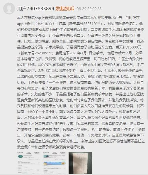 江湖老刘在某猫投诉平台上输入“新氧”,就看到有网友投诉称在新氧app上看到深圳贝漾美天医疗美容发布的双眼皮手术广告,当时便在app上缴纳了预付金拍下了订单。咨询师告知切眉后,能够呈现出很明显的双眼皮效果。于是便同意了做切眉这个方案。当天补齐5800元,切眉术后六个月,效果基本稳定了之后,发现切口处有凹陷,眉眼间距更近了,不符合美观要求。手术后两边眼皮不对称,有大小眼问题。完全没做出事先承诺的双眼皮效果。发起投诉后才发现新氧服务滞后,维权难等一系列问题,根本得不到自己想要的答复。
