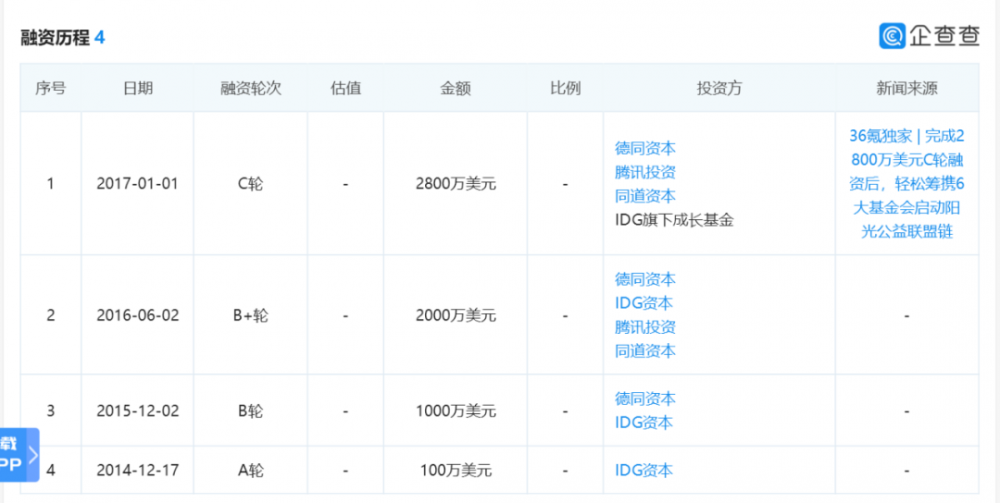 企查查数据显示,自2014年成立以来,轻松筹已经进行了4轮融资,合计融资金额为5900万美元,按照最新汇率计算,折合人民币4.17亿元。