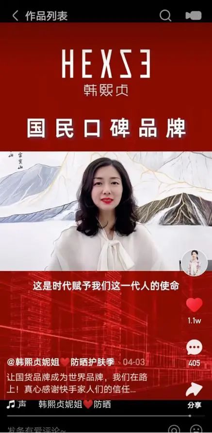 韩熙贞是一个创立于2012年的国产彩妆品牌,在2020年底,老板娘王妮创建了以“妮姐”为人设的品牌账号,由老板娘王妮亲自上阵当主播。“人设号”在卖货的同时,也建立了用户“面对的是人”的信念感。