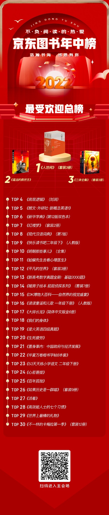 日前,京东图书年中榜发布,其中,总榜30种图书是今年上半年京东最畅销的图书。榜单中,梁晓声获奖图书《人世间》拔得头筹,成为京东图书上半年头号畅销书。《遥远的救世主》和《三体》紧随其后,使得榜单三甲位置被文学图书悉数占领。此外,经管、社科、励志、生活、童书等上榜图书也各有精彩,既可以作为读者选书购书的参考,也可以成为业内人士探查图书畅销秘诀的窗口。从即日起,到京东APP搜索“图书年中榜”即可直达专题页面。