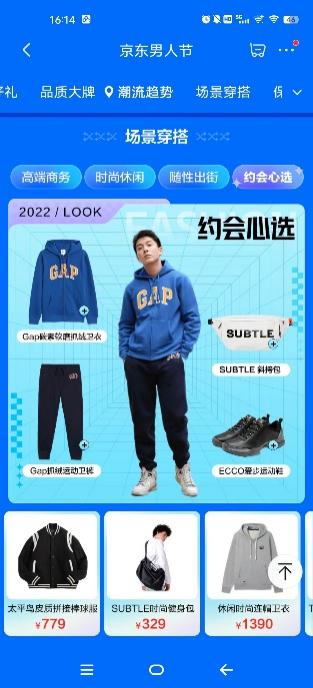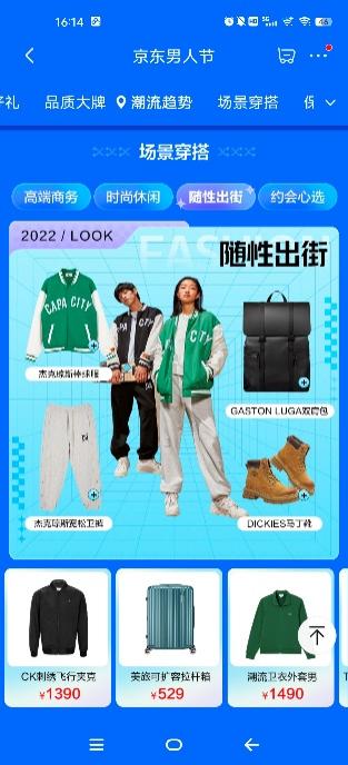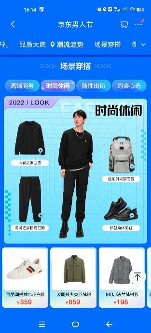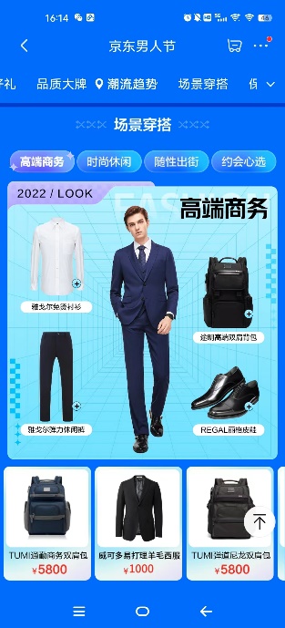 此外,在多元穿搭场景及需求的影响下,京东新百货“男人节”根据不同穿搭场景,为消费者提供了“高端商务”、“时尚休闲”、“随性出街”、“约会心选”四大场景穿搭方案。“高端商务”区涵盖免烫衬衫、弹力休闲裤、高端双肩包、皮鞋等多种品类,帮助消费者从头到脚打造商务精英形象;“时尚休闲”区精选卫衣、卫裤、时尚双肩包及休闲鞋,聚焦当下流行爆品,为消费者提供舒适潮流穿搭指南;“随性出街”区则包含了棒球服、牛仔裤、飞行夹克、马丁靴等品类,以更具个性化的服饰打造吸睛look;“约会心选”区为消费者精挑细选了抓绒卫裤、连帽卫衣、时尚挎包、运动鞋等潮流服饰,以清爽、舒适穿搭提升男士精致形象。