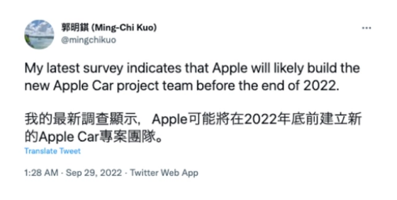 而这个所谓的“Apple Car”也就是之前一直被广为流传的苹果造车计划,但是早在之前郭明錤也曾爆料过,苹果「泰坦」造车团队已经解散有些日子了。如今又重新组建团队,代表苹果并没有放弃造车计划。