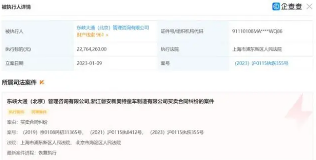 目前,东峡大通(北京)管理咨询有限公司被执行总金额超2817万。此外,该公司还存在多条失信被执行人、限制消费令和终本案件信息,未履行总金额超6.74亿元。