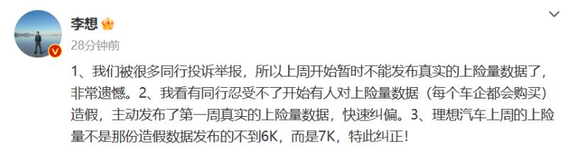 李想表示,我们被很多同行投诉举报,所以上周开始暂时不能发布真实的上险量数据了,非常遗憾。我看有同行忍受不了开始有人对上险量数据(每个车企都会购买)造假,主动发布了第一周真实的上险量数据,快速纠偏。理想汽车上周的上险量不是那份造假数据发布的不到 6K,而是 7K,特此纠正!