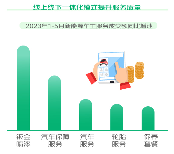 《报告》还指出了当下新能源车消费场景多元化、细分化的大趋势。随着近年露营、短途旅行的风靡,汽车充电装备、智能互联盒子等车载生活电器热销。与此同时,线上线下一体化模式备受消费者青睐,今年1-5月新能源车主服务成交额增速明显。