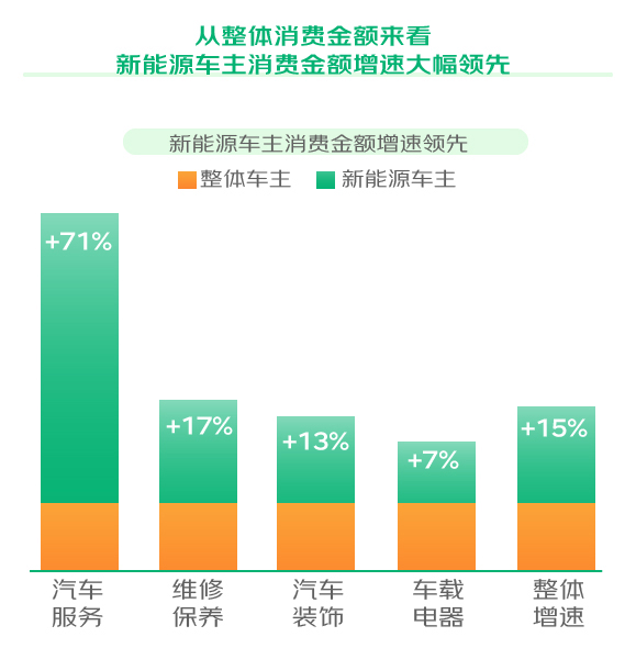 新能源车主拥有“硬核”消费实力,消费金额增速大幅领先于整体车主,汽车服务消费增速超过71%。其中,玩车改装和美容清洗人均消费分别超过整体100%、90%。