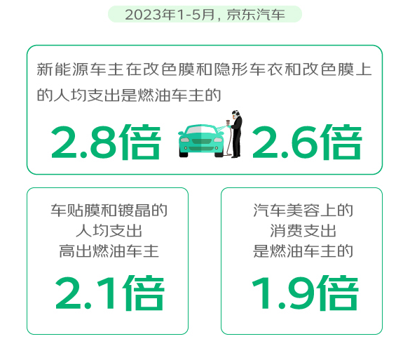 在汽车产品方面,新能源车主偏爱“内外兼修”,“好看”成为新能源车主的普遍追求。今年1-5月,京东汽车新能源车主在改色膜、隐形车衣上的人均支出分别是燃油车主的2.8倍、2.6倍;同时新能源车主在后排多媒体、电子改装、无钥匙等“智能内核”方面的开支,明显“壕”于燃油车主。