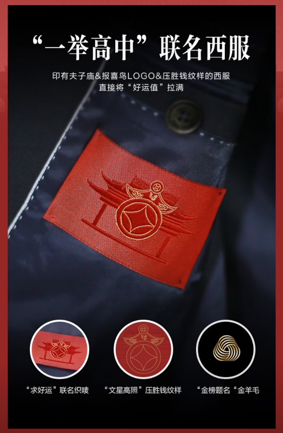 本款联名西服由国内知名服饰品牌报喜鸟和南京夫子庙共同打造。其中,报喜鸟的品牌名称本就具有“传递喜讯”之意,而南京秦淮河畔的夫子庙被誉为“中国四大文庙”之一,是古代学子祈求仕途顺利的重要场所。此次报喜鸟为联名西服特别设计了内兜图案,融合品牌logo、夫子庙和“压胜钱”元素。其中的“压胜钱”是古代学子必备的祈福钱币,承载着学子们“连中三元”“一品当朝”的美好心愿。