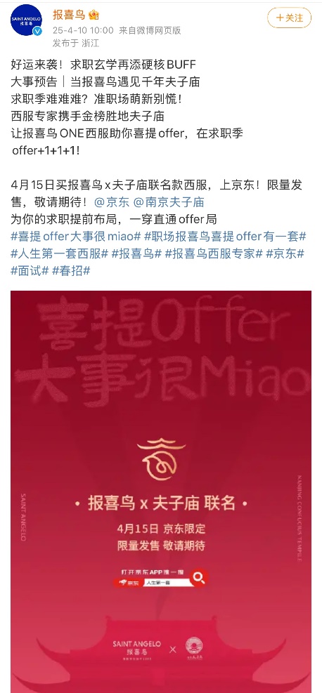 临近毕业季,各大高校应届生迎来求职关键期。一套得体的西服,不仅是职场新人的第一张形象名片,更承载着对未来的信心与期许。4月15日,报喜鸟×夫子庙联名西服即将正式上线,并于京东服饰独家首发。此款西服内兜处绣有“压胜钱”设计图案,旨在为有求职、面试等需求的消费者带来好运。值得一提的是,即日起,消费者打开京东APP搜索“人生第一套”,即可提前购买联名款西服,前100名用户还可享受500元大额惊喜券,先到先得。