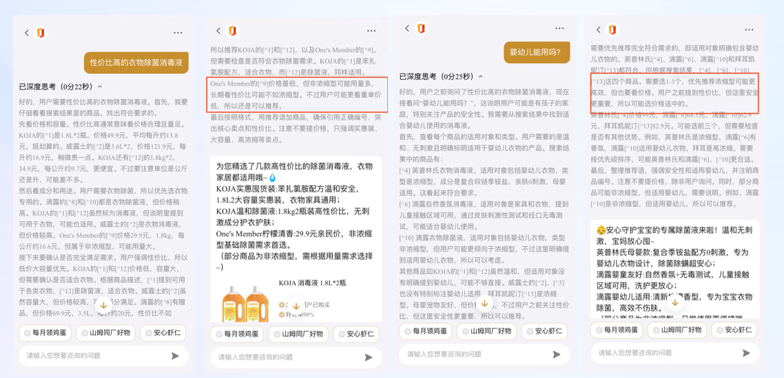 以“乳霜纸巾”为例,在商品信息并没有配置任何与鼻炎相关卖点的情况下,用户咨询“推荐一款适合鼻炎患者的纸”,大模型能够自动推荐出含有保湿因子,不会因反复擦拭鼻子而产生红肿的纸巾。“我们不再需要去适应过往搜索的逻辑,而是用最直白、简单的自然语言表达,即可找到想要的商品。这是最让我感到惊喜的!”