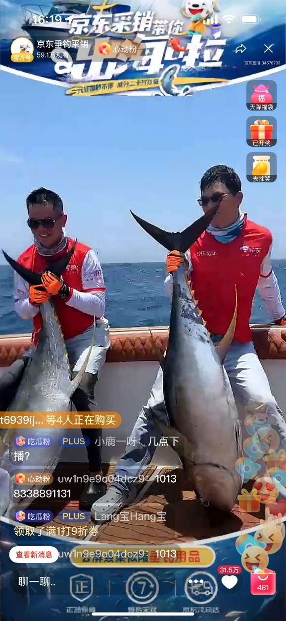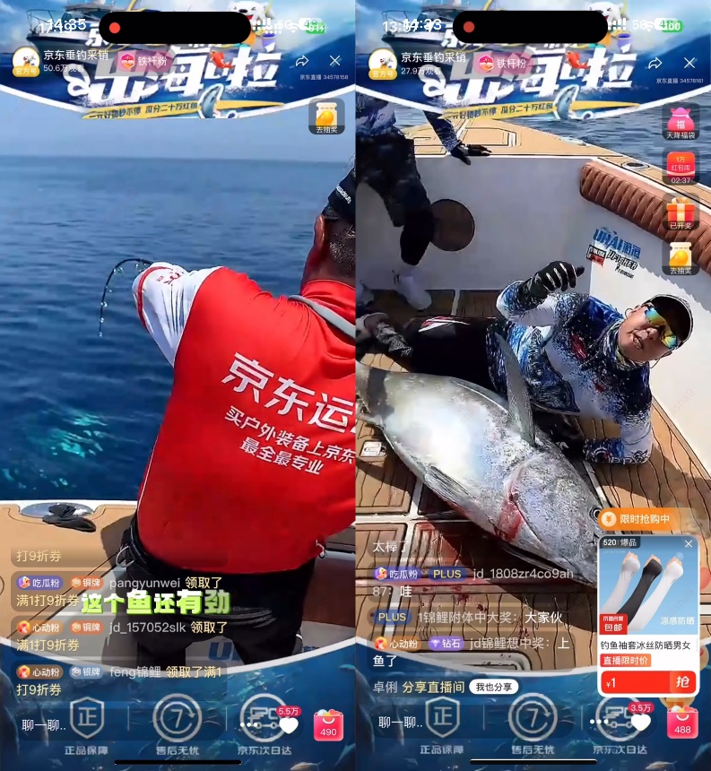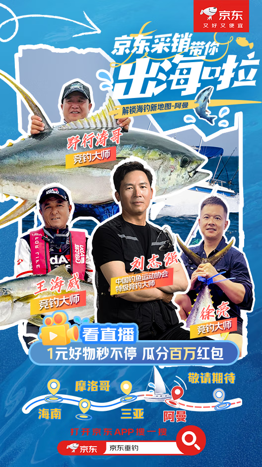 目前京东采销阿曼海钓直播正在进行中,即日起至5月1日,大家可以来京东 APP 搜索“海钓直播”进入京东垂钓直播间,一起期待重量级金枪鱼的上岸吧!