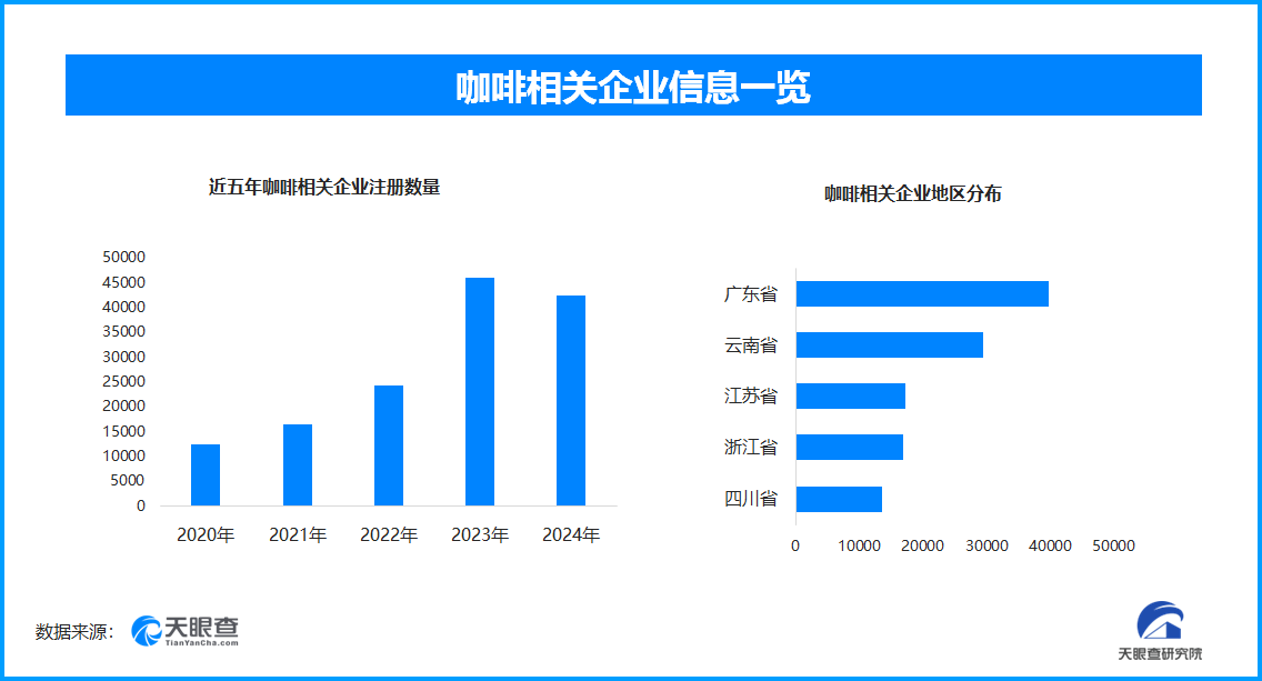 天眼查专业版数据显示,截至目前我国现存在业、存续状态的咖啡相关企业超24.6万家。其中,2025年截至目前新增注册相关企业约2.6万余家,从企业注册数量趋势来看,2023年以前,国内咖啡相关企业的注册数量呈现出逐年增长的态势,并在2023年达到顶峰,2024年稍显下降。