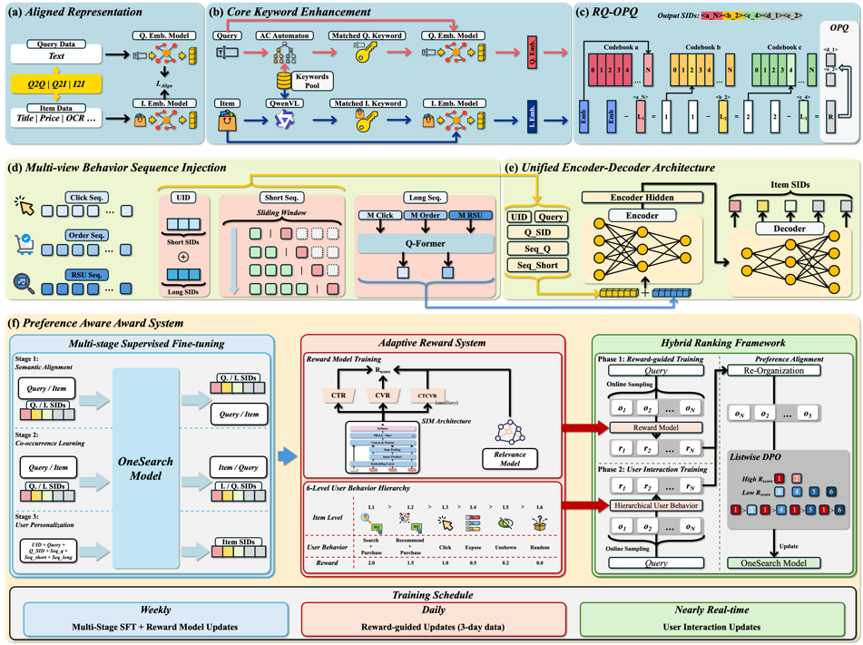 OneSearch框架集三大创新于一身:关键词增强层次量化编码(KHQE)模块、多视角用户行为序列注入策略以及偏好感知奖励系统(PARS)。