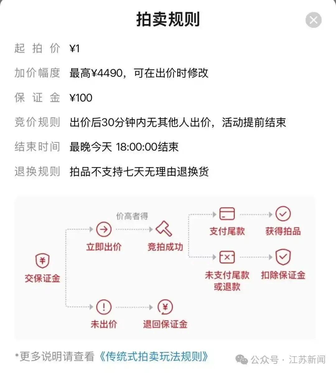 其中此次拍卖的规则设计成为舆论核心。平台设置 1 元起拍价,最高加价幅度 4490 元,而参拍仅需缴纳 100 元保证金 —— 即便竞拍成功后放弃支付,也仅扣除这笔保证金即可 “全身而退”。这种极低的违约成本,被网友调侃为 “花两张电影票钱买热搜体验卡”,法律人士则指出,100 元保证金远不足以约束恶意出价,且平台难以举证 “串通抬价”,客观上放任了价格失控。