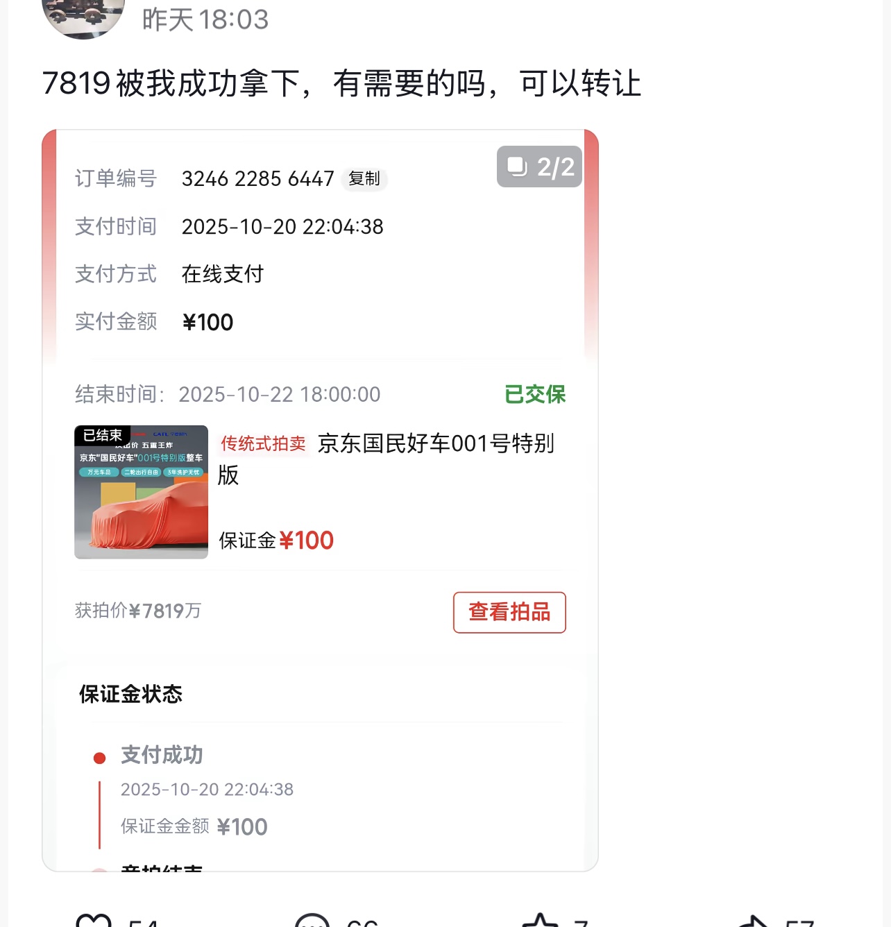 拍卖页面显示,竞价成功用户需在 24 小时内提交订单并 30 分钟内付款,逾期将取消订单。但截至 10 月 23 日上午,京东方面仍未确认出价者 “J***7” 是否完成支付,仅回应称 “正积极联系用户,若未支付将妥善处理车辆”,同时强调已全程监控出价行为,确认均为用户自主操作。