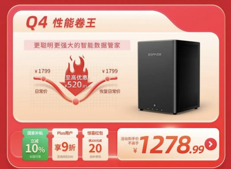 系统体验流畅,极影视、AI相册、多端备份等核心功能齐全,也支持Docker以满足进阶玩法。作为一款高性价比的四盘位NAS,它非常适合对存储容量有一定要求,同时又注重预算的家庭用户。做主要的是,作为四盘位NAS,他的双十一到手价格不到一千三百元,可以说真是性能卷王。