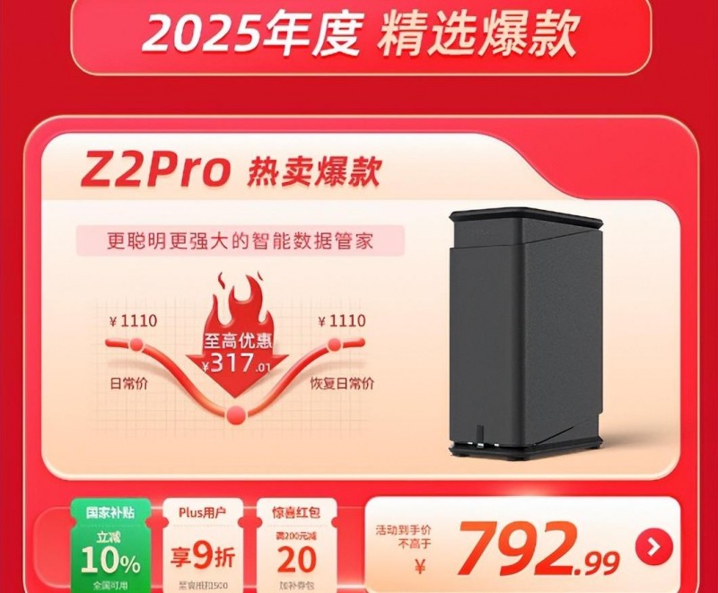 此外,它还提供两个M.2插槽用于安装固态硬盘,扩展性出色。网络方面,双2.5G网口保障了高速内网传输。接口丰富,包括HDMI、eSATA、Type-C和USB 3.2等,连接外设非常方便。其综合性能强大,既适合团队协作、在线文档编辑,也能作为家庭的影音娱乐中心。双十一期间是入手的好时机,适合对性能有较高要求的用户和小型工作室。最主要的是,双十一叠加各种优惠到手价格不到两千五。