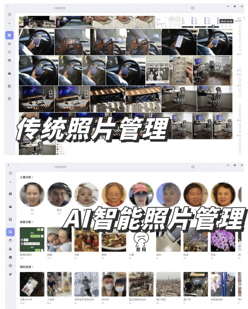 AI功能还体现在日常使用里。照片备份后,AI会自动按人像、场景、时间分类,还能精准识别证件照票据银行卡,需要的时候搜索关键词就能找到。视频里的人脸也能被自动检测,在相册里聚合相关视频片段。图片文字提取功能也很好用,中英文识别准确率高,提取后直接复制编辑,不用再手动输入。这种智能化设计,让NAS不再是专业用户的专属,普通家庭也能轻松用明白。