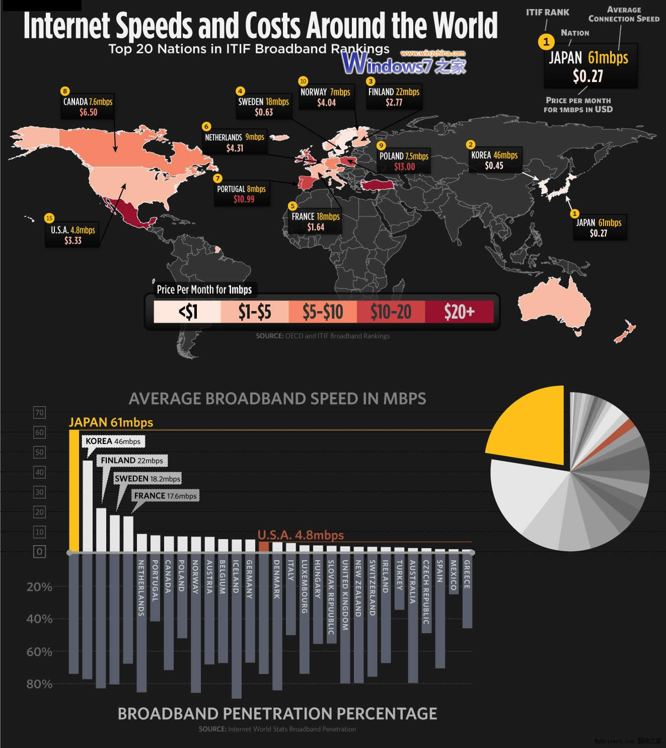 信息技术和创新基金会(ITIF)近日公布了一份统计图,列举了全球20大国家互联网的接入情况,包括平均网速和网费两个指标。 我们的近邻日本、韩国均处于遥遥领先的地位,不但61Mbps、46Mbps的网速远远超过其他国家,0.27美元和0.45美元的网费(均指每1Mbps平均成本)也是最低的。事实上,这也是唯一入围的两个亚洲国家,绝大部分都来自经济发达的欧美地区。 北欧的芬兰和瑞典分列三四位,网速22Mbps和18.2Mbps,不过网费差异较大,前者2.77美元,后者只有0.63美元,但同一地区的挪威相对落后一些,网速仅有7Mbps,但网费达到了4.04美元。 法国以17.6Mbps排在第五位,1.76美元的费用也不算高,而美国仅以7.6Mbps和6.50美元排在第15位。 网费最贵的两个国家是墨西哥和土耳其,都超过了20美元,另外英国、爱尔兰、西班牙、葡萄牙、土耳其、波兰等也都不便宜,均在10美元以上。一般来说,网络速度较快的单位成本就低一些,这在日韩身上体现最明显。 点击下图可查看大图片: