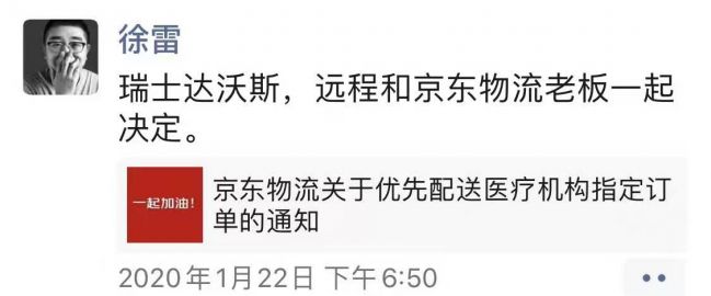 1月22日下午,还在瑞士达沃斯参加世界经济论坛的京东零售集团CEO徐雷,在手机上发了一条朋友圈,转发了“京东物流关于优先配送医疗机构指定订单的通知”,而这一决定是他与同在达沃斯的京东物流集团CEO王振辉共同作出的。