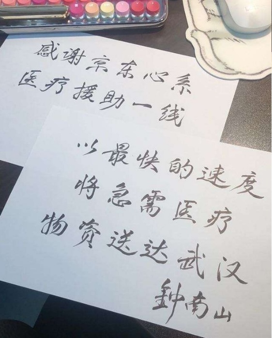京东对于疫情救援物资的快速响应让钟南山院士感动不已,他亲自提笔写下感谢信:“感谢京东心系医疗救助一线,以最快的速度将急需医疗物资送达武汉。”