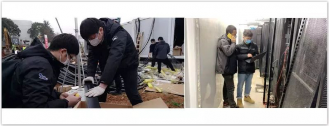图:奇安信前线人员在火神山医院现场紧张的安装调测设备
