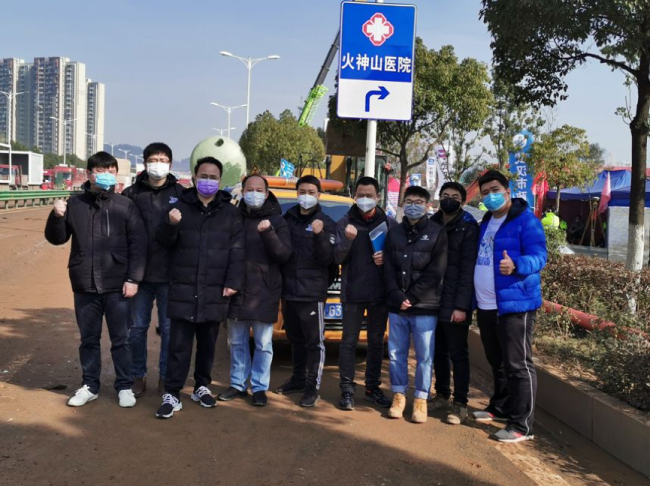 图:奇安信支援火神山医院建设9勇士合影(从左向右依次为:吴成鸷、朱波、魏雨露、黄宝、张宇、李虎、陈雅迪、唐晓峰、许岳)