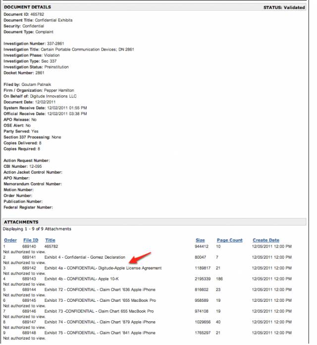 换句话说,苹果似乎正在将自己的多项专利移交给“专利流氓”Digitude,虽然首先经由一家与Digitude主要投资方及公司主席在同一间办公室里办公的空壳公司。关于苹果公司与Digitude存在合作关系的进一步证据,我们在ITC网站上的一份与此次诉讼有关的文件中找到,这些文件大多被标记为“机密”,但是好像工作人员忘记更改文件的名字了,其中有一份就是“Digitude-苹果许可协议”(见下面的截图)。