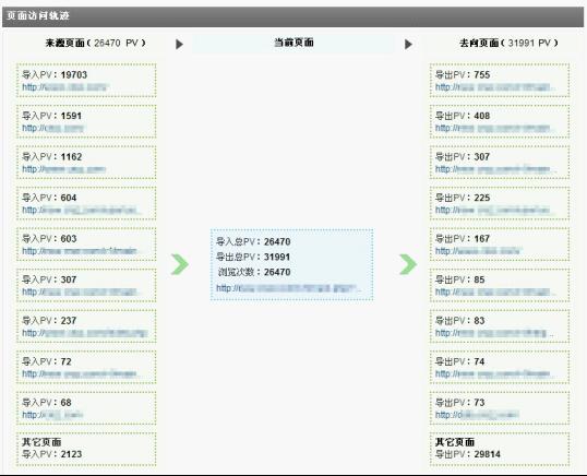 访客经常在网站中的各个页面之间跳转,访问的路径不胜枚举,但可以通过观察焦点页面及其上下游页面,掌握访客的来路和去向,发现较普遍的访客访问习惯。页面访问轨迹即用来完成该功能,用户可自由指定观察焦点页面,系统会列出该页面的前十位来路页面和去向页面。对观察焦点页面而言,其自身的导入、导出PV的多少能够反映出该页面在网站的权重地位,而通过观察来源和去向页面又能最大限度的了解到访客的行为习惯及兴趣点。