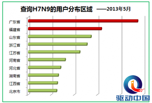 在查询H7N9的360搜索用户主要集中在禽流感高发的南方城市:广东省占据了14%,福建省9%,浙江省8%,江苏省7%。