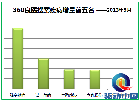 另据360良医搜索后台最新数据统计显示,除了关注度居高不下的H7N9,环比4月同期,黏多糖病、诺卡菌病的增量也比较明显。同时生殖感染、睾丸损伤的搜索频次在5月表现出明显增长。