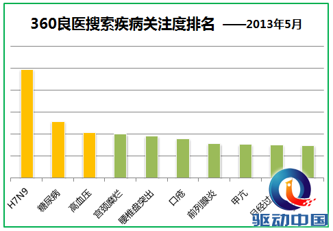 在上一期的良医播报中,禽流感在良医搜索中的搜索量名列疾病第一位。在本期的良医播报中,360搜索发现,禽流感的搜索量依然高居榜首,这主要和禽流感是一个社会热点话题有关。而中老年人群易患的疾病中高血压等也都榜上有名。排名病症搜索前三位的病症关键词依次为:H7N9、糖尿病、高血压,另外宫颈糜烂、腰椎盘突出、口疮、前列腺炎等病症也是网民关注的重点。