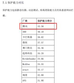 在用户保护能力上,包括动态测试、静态测试、病毒清理能力及钓鱼恶意网址拦截四大测试项目中,腾讯电脑管家均有不俗表现,尤其在防钓鱼能力上优势明显,最终在以43.30分雄踞榜首。