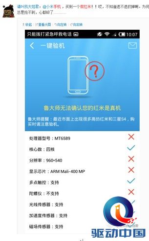 图:微博网友使用鲁大师鉴定出假红米手机